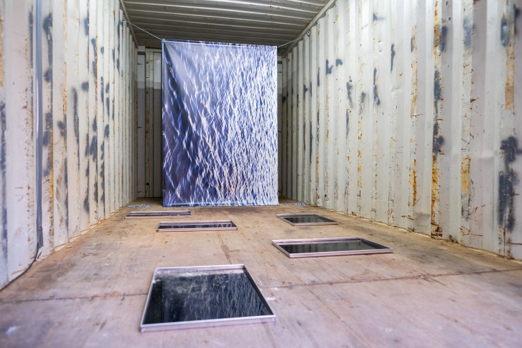 In the work Die Nacht schweigt still, the water surface of the Bay of Gdansk appears in abstracted form and meets trays filled with black liquid. The harbour of Gdansk is one of the largest container terminals in Europe. This time, the problematic flowed into the interior of a freight container.